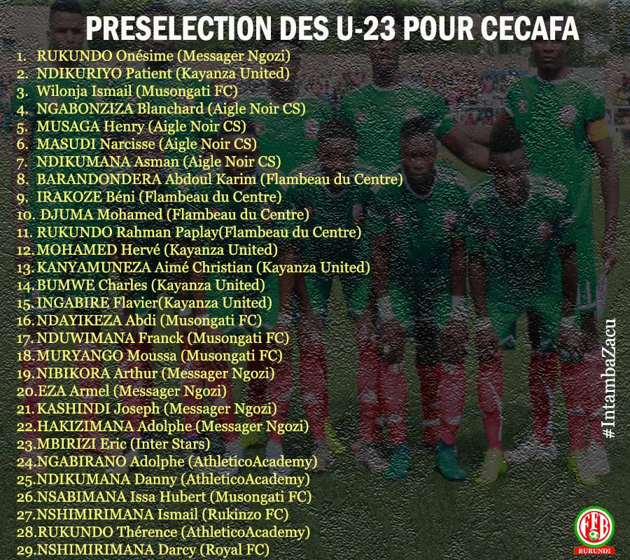 Le sélectionneur burundais, Jimmy Ndayizeye vient de convoquer une liste des joueurs locaux qui vont représenter le Burundi dans le prochain championnat régional de CECAFA des moins de 23ans, qui se tiendra en Ethiopie du 3 au 18 Juillet.